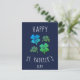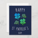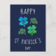Lucky Shamrock Clover Happy St. Patrick`s day Postcard. St. Patrick`s day card. Four shamrocks in different green shades on navy blue background. Clovers with four leaves for the luck.