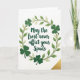 This greeting card features a friendly blessing, “May the frost never afflict your Spuds,” written large in dark emerald green across the center on a white background 💚. The lettering curves smoothly, giving the line a warm, teasing tone that feels like something shared between close friends. Around the words sits a circular wreath of twisting vines and small leaves, layered in many greens from deep forest to light spring tones. Tucked into the wreath are four shamrocks in a solid, darker green, evenly spaced like little lucky accents ☘️. The text stays centered while the greenery frames it closely, as if leaning in to spotlight the message. The open white space keeps the design airy, making the greens stand out without crowding the page. In the bottom-right corner, a narrow sliver of golden ribbon peeks in at an angle, adding a small warm highlight against the white.