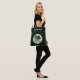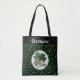 This fun monogrammed shamrock tote bag is great for Saint Patrick's Day, a gift an Irish friend, or for anyone who likes lucky shamrock themes. It includes three shamrocks with varying prints, including a primarily green print, a black print, and a "big cat" leopard animal pint, in a circle of white. The background is a pattern of green shamrocks against black, with green trim. Your monogram name appears at top in a vintage white typeface against black so make sure to type the name you want. The design is on both sides of the tote bag.