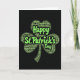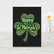 This card features a shamrock shape built entirely from lime-green words on a deep black background, creating a striking night-glow look ☘️. At the center, “Happy St. Patrick’s Day” appears in larger green lettering, anchoring the clover like a shared toast between close friends. The surrounding smaller text forms the leaves and curves, with scattered odd terms such as “Almans,” “Justico,” and “Govendullbey” adding a layered, puzzle-like texture. The contrast makes the green type look almost lit from within, as if the clover is hovering in the dark. A tiny four-leaf clover icon sits near the main message, tucked in like a little lucky wink 💚. The overall layout feels modern and festive while still keeping the focus on the central greeting. The shamrock’s edges are defined by dense, tightly packed micro-words that taper into crisp points and rounded lobes.