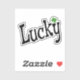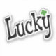 The word Lucky in a fun font with a small green four leaf clover.