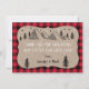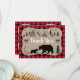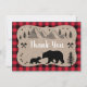 This cute baby shower card features a cute bear with mountains, trees and stars and a red plaid background.