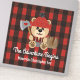 Lumberjack and wilderness themed baby boy vinyl sticker with a cute teddy bear in a knit cap, flannel shirt and suspenders and grey diapers with a diaper pin. He holds an axe with a heart on it in front of a tree stump. The Adventure Begins is a fitting theme for the new mum or parents to be expecting a baby boy. Artwork © Chrissy H. Studios, LLC. All rights Reserved.