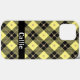 Black and pastel yellow diagonal "lumberjack" checkered pattern with matte gold grid overlay. Customizable text in modern white font on this personalized phone case.