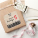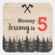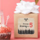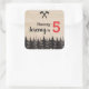 Lumberjack boy birthday party favour sticker with an axe & forest icon personalised with your child's name & birthday message.