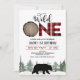 Cute lumberjack themed first birthday invitation for baby boy featuring a black bear silhouette, wood slice, axes, pine forest and modern calligraphy heading. This wild one lumberjack themed 1st birthday invitation is ideal for a winter birthday.