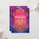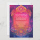 At the centre of the design, the focal point is a large, elegant lotus motif at the bottom, symbolising purity, enlightenment, and new beginnings. The central space within the arch is designed to hold the invitation’s text, where white or gold lettering would stand out beautifully against the radiant background. This area provides ample room for event details, while the surrounding artwork frames the text, giving it a regal and festive presentation.