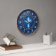 Make a powerful and inspiring statement of faith with this high-energy religious wall clock. The central design features a striking, luminous light-blue cross set against a deep azure backdrop with radiating sunburst lines. The cross is elegantly framed by intricate faux-metal scrollwork and a circular border of studded accents. While the outer rim beautifully mimics the appearance of weathered, dark-stained timber and the numeric markers look like raised sky-blue carvings, this is a lightweight and durable graphic timepiece rather than actual wood or heavy metal. The bold, light-blue numbers provide exceptional contrast against the dark face, ensuring the time is easy to read at a glance. The artwork utilizes expert shading to create a stunning 3D-style depth, giving the piece a polished and professional look. This timepiece is a perfect focal point for a living room, study, or sanctuary.