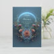 Transport your guests to a world of modern enchantment with this breathtaking celestial botanical arrangement. At the heart of the design lies a magnificent, multi-layered bloom in vibrant shades of teal and orange. This central piece is flanked by a symmetrical, curving array of delicate pink tulip bud, soft orange rose blossom, and airy white wildflower spray. A striking, luminous blue neon-style halo arches over the top, casting a magical glow against the deep, moody teal background. Feathery golden wheat sprig elements add a touch of natural texture to this ethereal garden scene. This wedding invitation is a premier choice for a celestial-themed ceremony, a modern evening gala, or a high-end fantasy celebration. These motifs ensure your event details are presented within a truly unique and sophisticated atmosphere that sets a magical tone from the very first glance.
