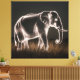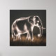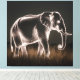 Luminous Elephant Silhouette, a photograph of a silhouette of a luminous elephant. The elephant's body is illuminated, with the light highlighting the majestic height of its trunk and the arch of its back. The elephant is standing in a field of tall grasses, which are also illuminated. The background is a solid black. The lighting creates a sense of grandeur.