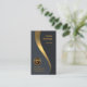 Overleaf, in a black cover, the details are at the centre. The faux gold logo is at the top with a slogan tagline just below. The business name and contact details lie near the card's floor.