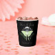 A vibrant green luna moth is surrounded by moon phases and lush green leaves against a deep black background.