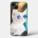 Fun cat lovers iphone case with graphics of a white kitten, in space, wearing plasma galaxy glasses. Customise to add your own text.
