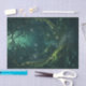 A glowing path filled with lightning bugs leads into a teal and green forest.