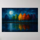 A radiant moon casts its glow over a tranquil body of water, illuminating a row of trees whose foliage transitions through a full chromatic spectrum—from verdant green to golden yellow, fiery orange, deep crimson, and violet dusk. The night sky, rich with stars and swirling clouds, envelops the scene in serenity, while the water below mirrors the vibrant gradient with gentle distortion. Lunar Spectrum invites viewers into a dreamlike moment where colour, light, and reflection converge. It evokes themes of emotional transformation, seasonal passage, and the quiet magic of moonlit solitude.