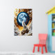 A majestic white wolf howls at the moon, bathed in a golden light, against a backdrop of swirling clouds and celestial bodies. The wolf stands on a rocky outcrop, its silhouette framed by the crescent moon.
