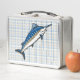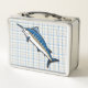 Not many fish are more incredibly beautiful than the blue marlin -- and not many fish are larger. The blue marlin is the largest of the Atlantic marlins and, seriously, one of the biggest fish in the world. As with some species, the female is often quite a bit larger than the male. Females can grow up to 14 feet long and can weigh more than 1,900 pounds, though the average runs more around 11 feet long and 300-ish pounds. A deep blue on top and silvery-white beneath, with a pronounced dorsal fin and a long, lethal, spear-shaped upper jaw (that some refer to as a bill), blue marlins are one of the most easily identifiable and recognisable fish in the world. Marlins are renown for their incredible stamina in a fight when they are hooked, which makes them a trophied favourite of big game fishermen. Though it can also be said of virtually any super big fish, I can't imagine there's much more thrilling to the avid angler than hooking one of these giants and seeing it break water in the fight. This design pays homage more to this majestic fish than the anglers that seek it. For this wonderful lunchbox, a single blue marlin (on either side) leaps on a sea of colour-coordinated plaid. This marvellous lunchbox is an excellent choice for Father's Day, father's birthday or any day you are celebrating your favourite angler or future angler.