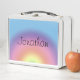 Rainbow over blue sky. Personalise front of box with Name. It will print over the arched rainbow in script font. Rainbow on both sides. Choose the colour of the box - all available colours go well with the colours of the rainbow: green, yellow, orange, red, pink, purple, and blue.