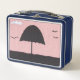 This blue lunch box is designed with my depiction of a beach umbrella silhouetted against a pink sunset sky.