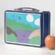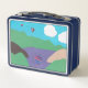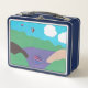 This lunch box is designed with my depiction of a mountain lake scene complete with balloons and clouds.