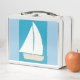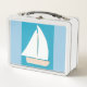 This white lunch box is designed with my depiction of a white sailboat on a turquoise and blue background.