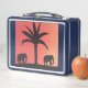 This lunch box is designed with my depiction of two elephants and a palm tree silhouetted by an orange sunset.