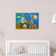 A cartoon yellow alien from outer space sitting outdoors to lunch and having a drink of grunge soda and a bowl of some strange cabbage. There is a little ladybug eating from the crumbs of the creatures table. You can see planets and other worlds in the distance.