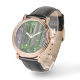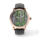 Stylish men's wrist watch with white numerals that features the photo image of a lush, evergreen, conifer forest in the Pacific Northwest. Select your watch from several styles.