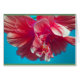 Colour photograph of a triple, red hibiscus in my garden. Green border on top and bottom.