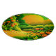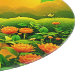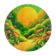 Explore a vibrant, stylised landscape illustration with lush green hills, orange flowers and fruit, bathed in the glow of a large sun (This Design Made With AI). Place Order Today and Embrace the Joy of Shopping!