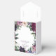 Watercolor flowers in shades of rich burgundy, gentle lilac, deep eggplant purple and pinkish orchid pair with modern green botanicals such as ferns and eucalyptus in these romantic, elegant wedding favour boxes.