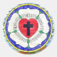 The Luther Rose's symbolism dates back to the 1520s. Luther explained that the red heart with the black cross represents the righteous living by faith in Christ the Crucified. The heart rests on a white rose, symbolising joy, comfort, and peace found through faith. The choice of white reflects the colour of heavenly spirits and angels. The white rose is set against a blue field, representing heaven, to signify that earthly joy and faith are just the beginning of eternal heavenly joy. Surrounding the blue field is a gold ring, symbolising the endless and precious happiness of heaven.