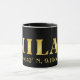 Stylish coffee mug features the city of Milan, Italy's latitude and longitude map coordinates in gold fonts on black background.