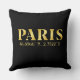 Throw pillow design features Paris, France latitude and longitude map coordinates in gold text on black background.