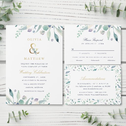 Affordable custom printed wedding couple's shower invitations personalised with your event details. This elegant design features a faux gold foil ampersand with delicate blue and green watercolor foliage on a white background. Use the design tools to customise the text, edit the fonts and colours or add your own photos to create a classy and stylish wedding shower invitation.