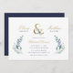 Affordable custom printed wedding rehearsal dinner invitations personalised with your event details. This elegant design features a faux gold foil ampersand with delicate blue and green watercolor greenery on a white background. Use the design tools to customise the text, edit the fonts and colours or add your own photos to create a classy and stylish wedding invitation.