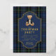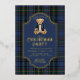 This preppy blue tartan party invitation has a cute sitting bear holding a gift. All the party details and the notched frame are in gold foil. The back features a coordinating blue tartan pattern.