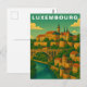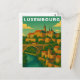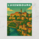 Capture the majestic and layered beauty of the Grand Duchy with this elegant Luxembourg Travel Card. This vintage-style illustration showcases the city's unique geography, featuring a grand stone viaduct arching over a deep green valley and a winding blue river.