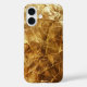 This image showcases a smartphone case featuring a luxurious gold foil texture. The design mimics the appearance of crumpled metallic gold leaf, giving it a rich and elegant look. The texture has an intricate pattern of creases and folds, reflecting light in different directions, creating a shimmering effect. The case is designed for an iPhone, evident from the dual-camera cutout and sleek form. This stylish accessory combines sophistication with a modern aesthetic, making it a perfect choice for those who appreciate a premium and eye-catching design.