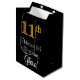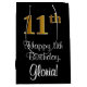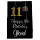 This stylish, elegant, and sophisticated birthday gift bag design features a large ordinal number “11th” having a faux/imitation gold-like gradient pattern, along with the birthday greeting message “Happy 11th Birthday,” and a custom recipient name in a script-style font. It also has a black-coloured background. A stylish gift bag like this might be used when giving a gift or present in honour of somebody’s 11th birthday. [~Z0000514]