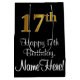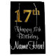 This luxurious, stylish, and elegant birthday giftbag design features a large ordinal number “17th” having a faux/imitation gold-inspired look, along with the birthday greeting message “Happy 17th Birthday,” and a customisable recipient name in a script-style font. It also has a black-coloured background. A birthday themed gift-bag like this might be a fun way to wrap a gift or present being given to somebody who is celebrating their 17th birthday. [~Z0000514]