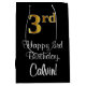 This stylish, luxurious, and elegant birthday themed giftbag design features a large ordinal number “3rd” having a faux/imitation gold-inspired look, plus the birthday greeting message “Happy 3rd Birthday,” and a customisable recipient name in a script-style font. The background is coloured black. A birthday themed giftbag like this might be used when giving a gift or present in celebration of somebody’s 3rd birthday. [~Z0000514]