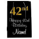 This sophisticated, luxurious, and elegant birthday themed gift bag design features a large ordinal number “42nd” having an imitation/faux gold-inspired gradient pattern, along with the birthday greeting message “Happy 42nd Birthday,” and an editable recipient name in a script-style font. It also has a black-coloured background. A birthday themed gift bag like this might be used when giving a gift or present in celebration of somebody’s 42nd birthday. [~Z0000514]