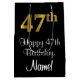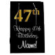 This sophisticated, elegant, and stylish birthday gift bag design features a large ordinal number “47th” having a faux/imitation gold-inspired gradient pattern, plus the birthday greeting message “Happy 47th Birthday,” and a custom recipient name in a script-style font. The background is coloured black. An elegant gift bag like this might be used when giving a gift or present in honour of somebody’s forty seventh birthday. [~Z0000514]