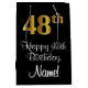This sophisticated, luxurious, and stylish birthday giftbag design features a large ordinal number “48th” having an imitation/faux gold-inspired look, plus the birthday greeting message “Happy 48th Birthday,” and an editable recipient name in a script-style font. It also has a black-coloured background. An elegant gift-bag like this might be used when giving a gift or present in honour of somebody’s 48th birthday. [~Z0000514]