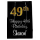 This sophisticated, elegant, and luxurious birthday themed gift bag design features a large ordinal number “49th” having an imitation/faux gold-like look, along with the birthday greeting message “Happy 49th Birthday,” and a personalised recipient name in a script-style font. The background is coloured black. An elegant gift bag like this might be used when wrapping presents being given to somebody in celebration of their forty ninth birthday. [~Z0000514]