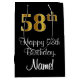 This elegant, stylish, and sophisticated birthday-themed giftbag design features a large ordinal number “58th” having a faux/imitation gold-like look, along with the birthday greeting message “Happy 58th Birthday,” and a customisable recipient name in a script-style font. The background is coloured black. A birthday themed gift bag like this might be a fun way to wrap a gift or present being given to somebody who is celebrating their fifty eighth birthday. [~Z0000514]