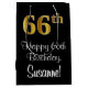 This elegant, sophisticated, and luxurious birthday giftbag design features a large ordinal number “66th” having a faux/imitation gold-inspired look, plus the birthday greeting message “Happy 66th Birthday,” and a personalised recipient name in a script-style font. The background is coloured black. A birthday themed gift bag like this might be a fun way to wrap a gift or present being given to celebrate somebody’s sixty sixth birthday. [~Z0000514]