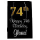 This luxurious, elegant, and sophisticated birthday gift bag design features a large ordinal number “74th” having an imitation/faux gold-like gradient pattern, in addition to the birthday greeting message “Happy 74th Birthday,” and an editable recipient name in a script-style font. It also has a black-coloured background. A birthday themed gift-bag like this might be a fun way to wrap a gift or present being given to celebrate somebody’s seventy fourth birthday. [~Z0000514]