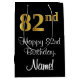 This stylish, luxurious, and sophisticated birthday-themed gift bag design features a large ordinal number “82nd” having an imitation/faux gold-like appearance, in addition to the birthday greeting message “Happy 82nd Birthday,” and an editable recipient name in a script-style font. The background is coloured black. A birthday themed giftbag like this might be used when giving a gift or present in celebration of somebody’s 82nd birthday. [~Z0000514]